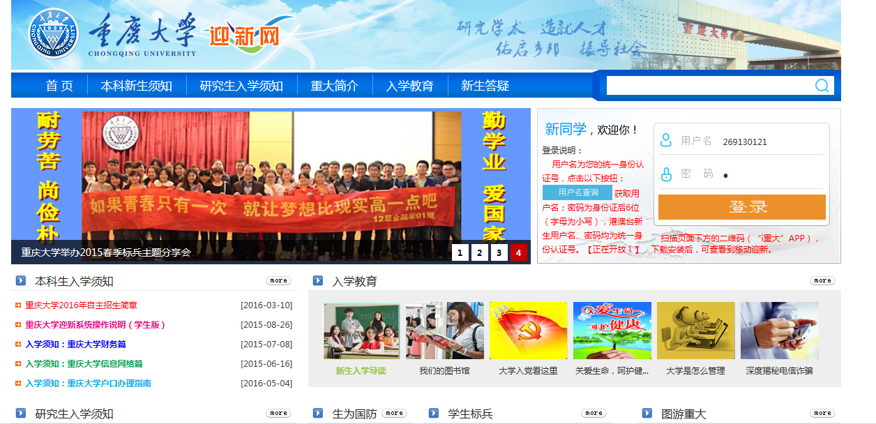 通过“重庆大学迎新网”或直接登录“重庆大学研究生院”(网址://graduate.sht18.org/)主页,点击右侧“管理系统登录入口”,输入“编号”(即您的学号,请查看录取通知书)、“密码”(您的出生年月日,如19820108)和“登录类型”(选择“学生”)。(技术支持电话:023-65112125)。