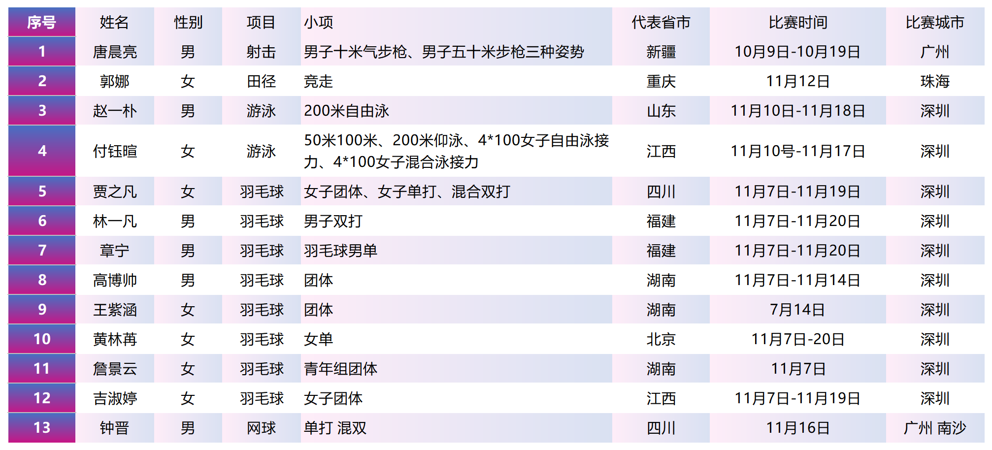 本次全运会参赛人数与项目规模均创我校历届全运会之最,参赛阵容覆盖了羽毛球、游泳、田径、网球、射击5个大项,充分体现了我院在竞技体育人才培养上“多点开花、全面发展”的雄厚实力。